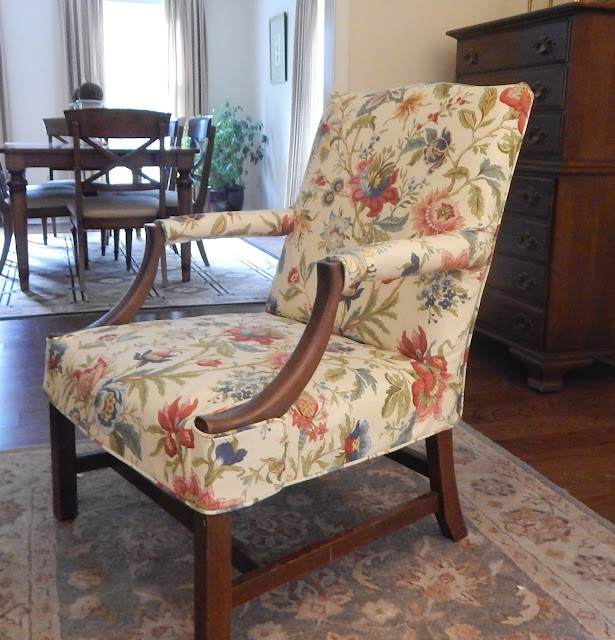 Martha Washington chair in a cheery traditional floral. See the Before HERE